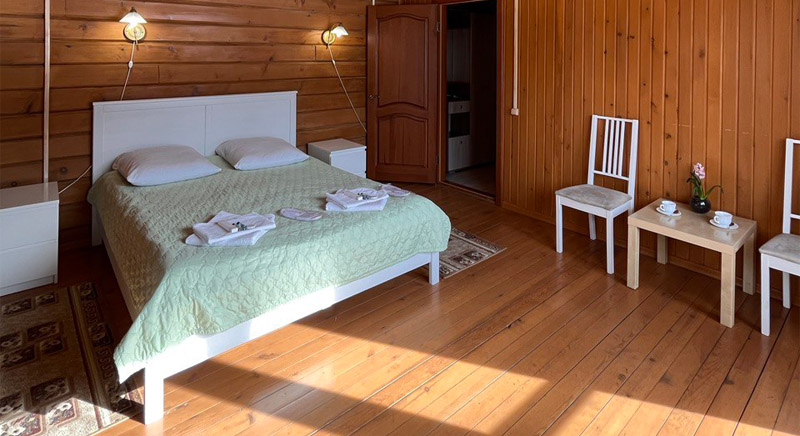 Спальня: двухспальная кровать, две прикроватные тумбочки, два стула, журнальный столик. Санузел с душевой кабиной, раковиной, унитазом.
